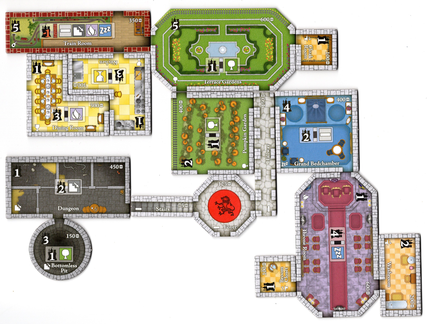 Este juego combina una mecánica de compra/subasta con la colocación de losetas. Es un juego que tiene muchas variables a considerar durante el desarrollo de la partida que lo hace muy atractivo a los jugadores más exigentes pero a su vez sus mecánicas y reglas son lo suficientemente sencillas y asequibles para hacerlo también atractivo a jugadores más "casuales". El hecho de poder ir construyendo tu Castillo con sus estancias y habitaciones también lo hace muy atractivo visualmente durante la partida. Componentes: 75 habitaciones de castillo, 6 escaleras, 9 pasillos, 4 halls, 24 favores, 76 monedas de 1000, 20 monedas de 5000, 4 marcadores de jugador, 1 marcador de maestro constructor, 4 tarjetas de referencia, 27 cartas de bonificación, 1 tablero de contratación de doble cara, 2 tableros de habitaciones, 1 tablero de pasillos, 1 torre de puntuación y el reglamento.