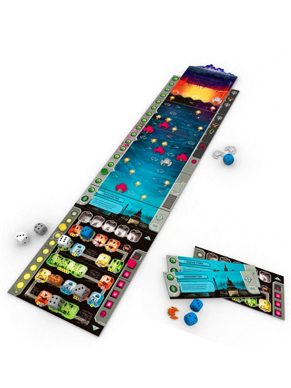 Cielos de Metal es un juego en solitario con una campaña multi-misión. En cada misión, te encargas de defender una ciudad asediada. Tus acciones son impulsadas por una innovadora mecánica de colocación de dados. Cuando eliges una acción, también estás eligiendo qué naves enemigas descenderán. Los números más grandes dan mejores efectos, pero también hacen que las naves desciendan más rápido.