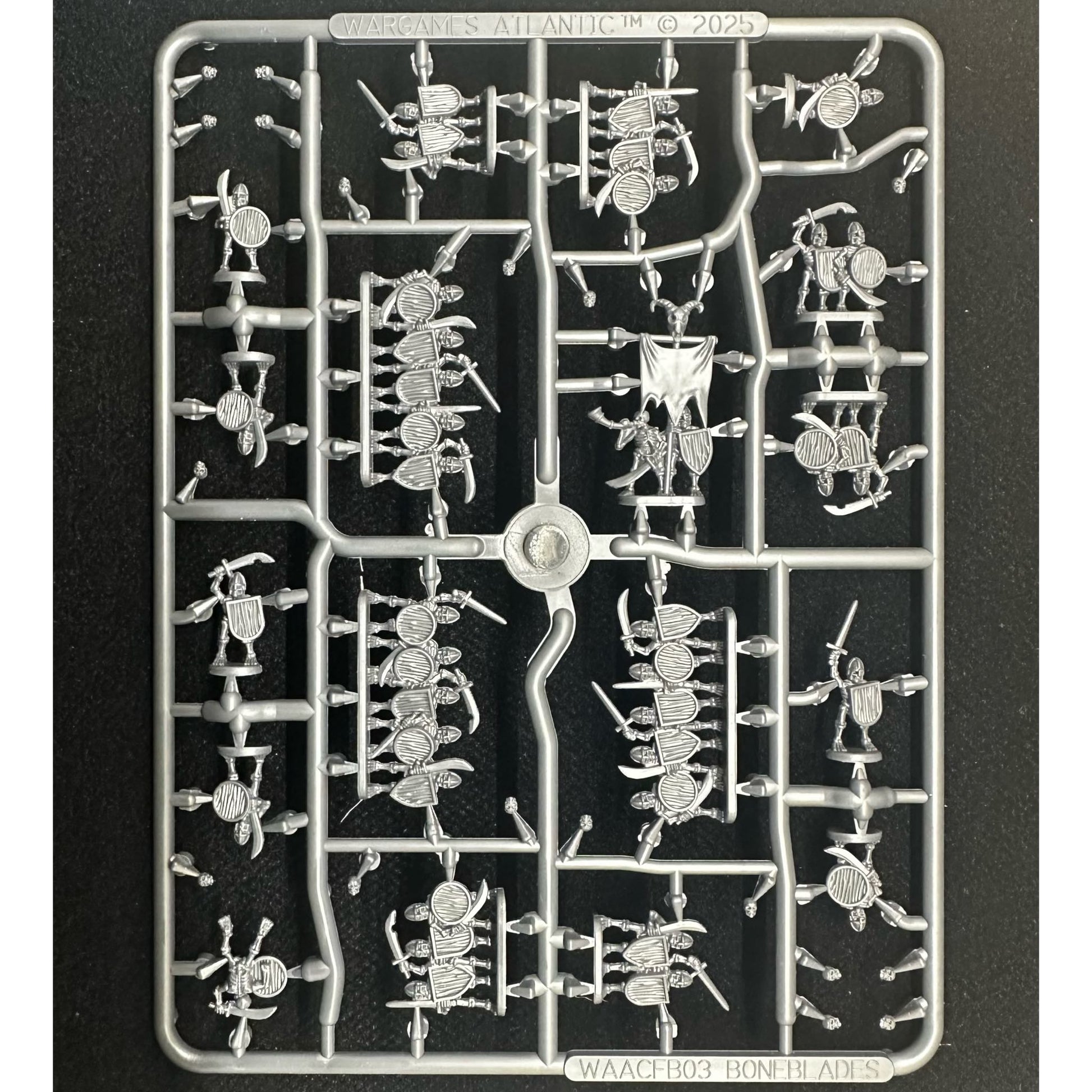 The Boneblades (Set de Figuras de Esqueletos) Los Boneblades son la élite de la vasta hueste del Nigromante, formando la vanguardia en cualquier batalla. Armados con espada y escudo, recuerdos olvidados impulsan sus hojas hacia el enemigo. Este set de plástico duro proporciona una gran cantidad de figuras para formar el núcleo de tu ejército no muerto.