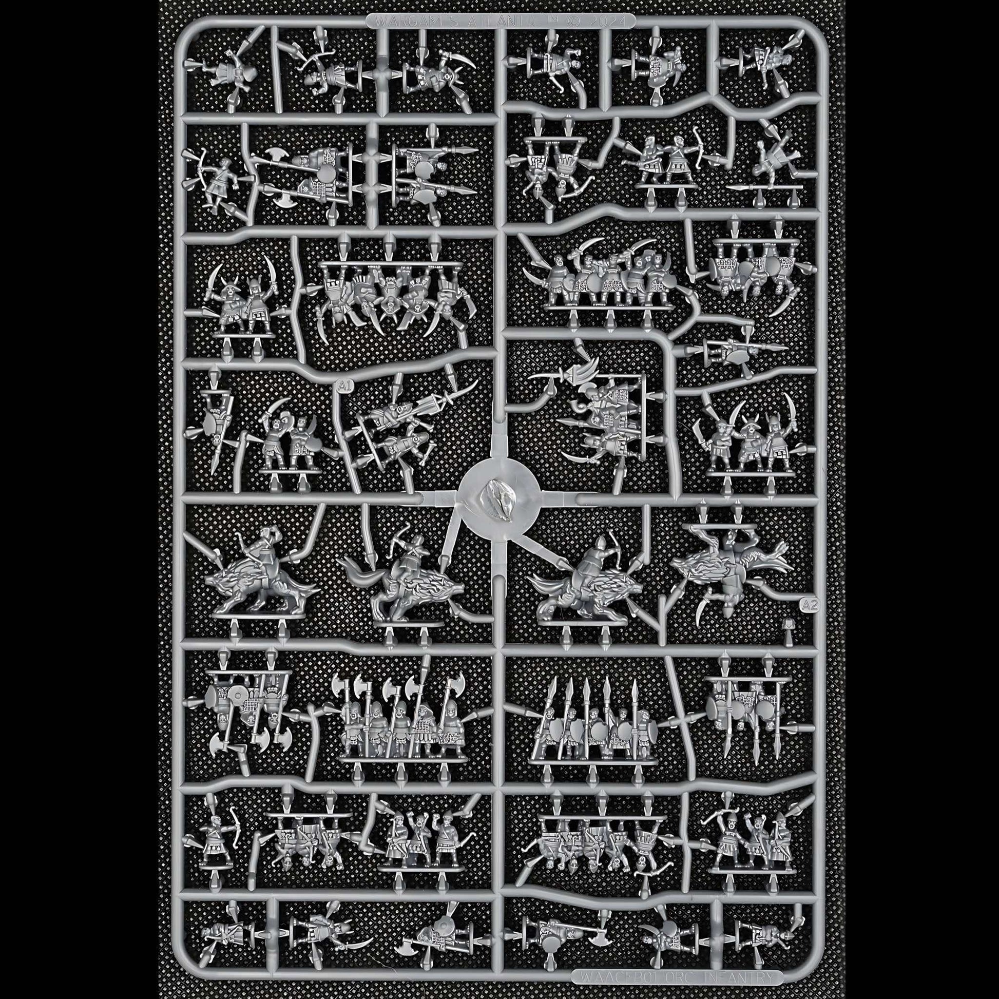 Esta caja en plástico duro incluye 252 miniaturas: 72 arqueros, 36 lanceros, 36 espadachines ligeros, 36 espadachines pesados, 36 hacheros pesados, 12 jinetes de huargo, además de 15 figuras de mando y 9 bajas. Incluye también peanas duales de 40x20 mm.