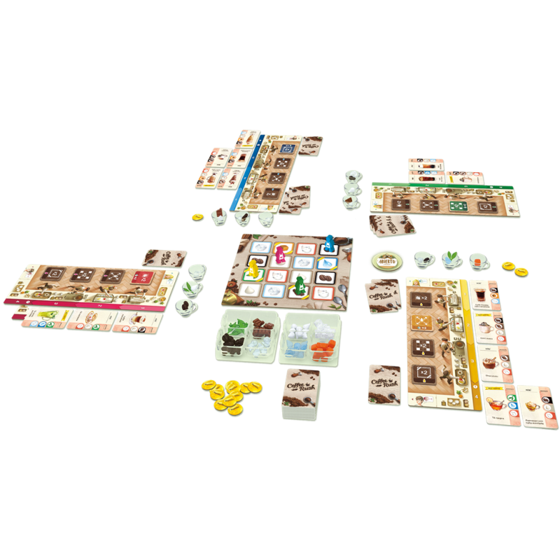 Tablero de Ingredientes x 1, tableros individuales x 4, fichas de Mejora x 16 (4 de cada color: rojo, azul, verde y amarillo), peones x 6 (2 rojos, 2 azules, 1 verde y 1 amarillo), reglamento x 1, bandejas para ingredientes x 2, cartas de Pedido x 80, tazas x 12, granos de café x 18, leche x 12, vapor x 12, hielo x 12. chocolate x 12, caramelo x 12, hojas de té x 12, agua x 12, fichas de Ingrediente x 102, fichas de Rapidez x 15, marcador de Jugador inicial x 1.