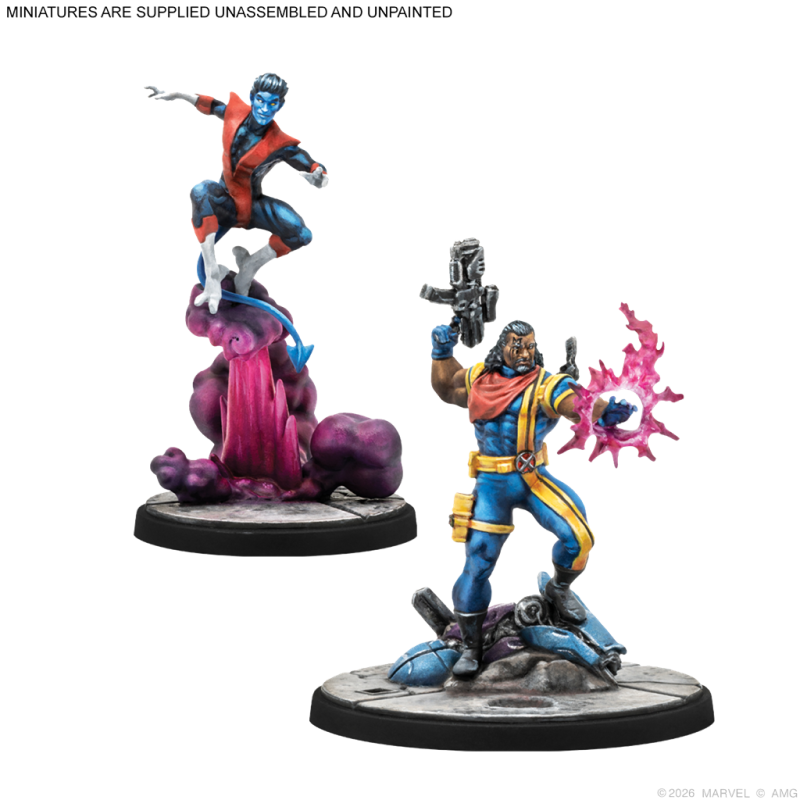 1 miniatura de Bishop, 1 miniatura de Coloso, 1 miniatura de Magik, 1 miniatura de Rondador Nocturno, 4 peanas, 4 cartas de atributos de Personaje, 6 cartas de Tácticas de equipo