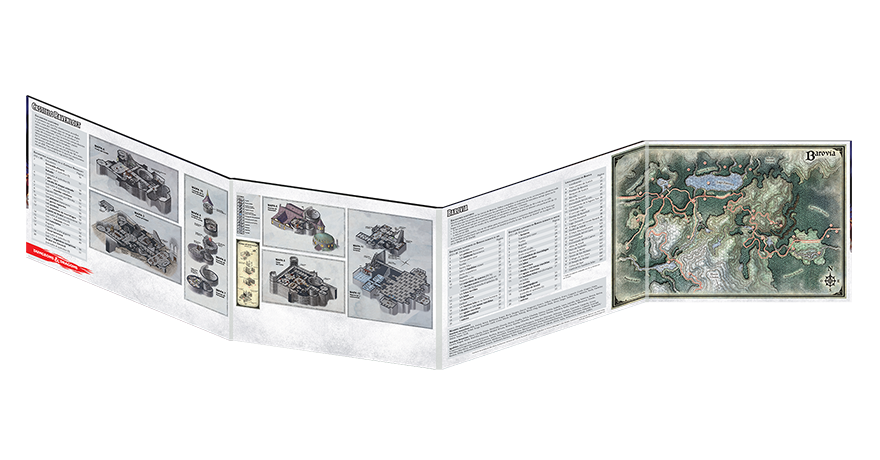 Esta pantalla es la compañera perfecta de aquellos Dungeon Masters que están dirigiendo La Maldición de Strahd. La parte frontal muestra varias imágenes del Conde Strahd von Zarovich, mientras que el interior contiene los mapas del Castillo Ravenloft y de la región de Barovia, que lo rodea, así como tablas de encuentros aleatorios para ambos.