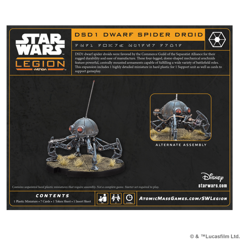 Los droides araña eran muy preciados por los Gremios de Comercio de la Alianza Separatista por su diseño robusto y producción asequible. Estos arácnidos mecánicos cuadrúpedos poseen un cuerpo esférico con potentes sistemas de armamento integrados capaces de desempeñar un amplio abanico de funciones en el campo de batalla. Esta expansión contiene 1 miniatura esculpida con todo lujo de detalle con la que puede formarse 1 unidad de Apoyo, así como las cartas necesarias para utilizarla en tu ejército.