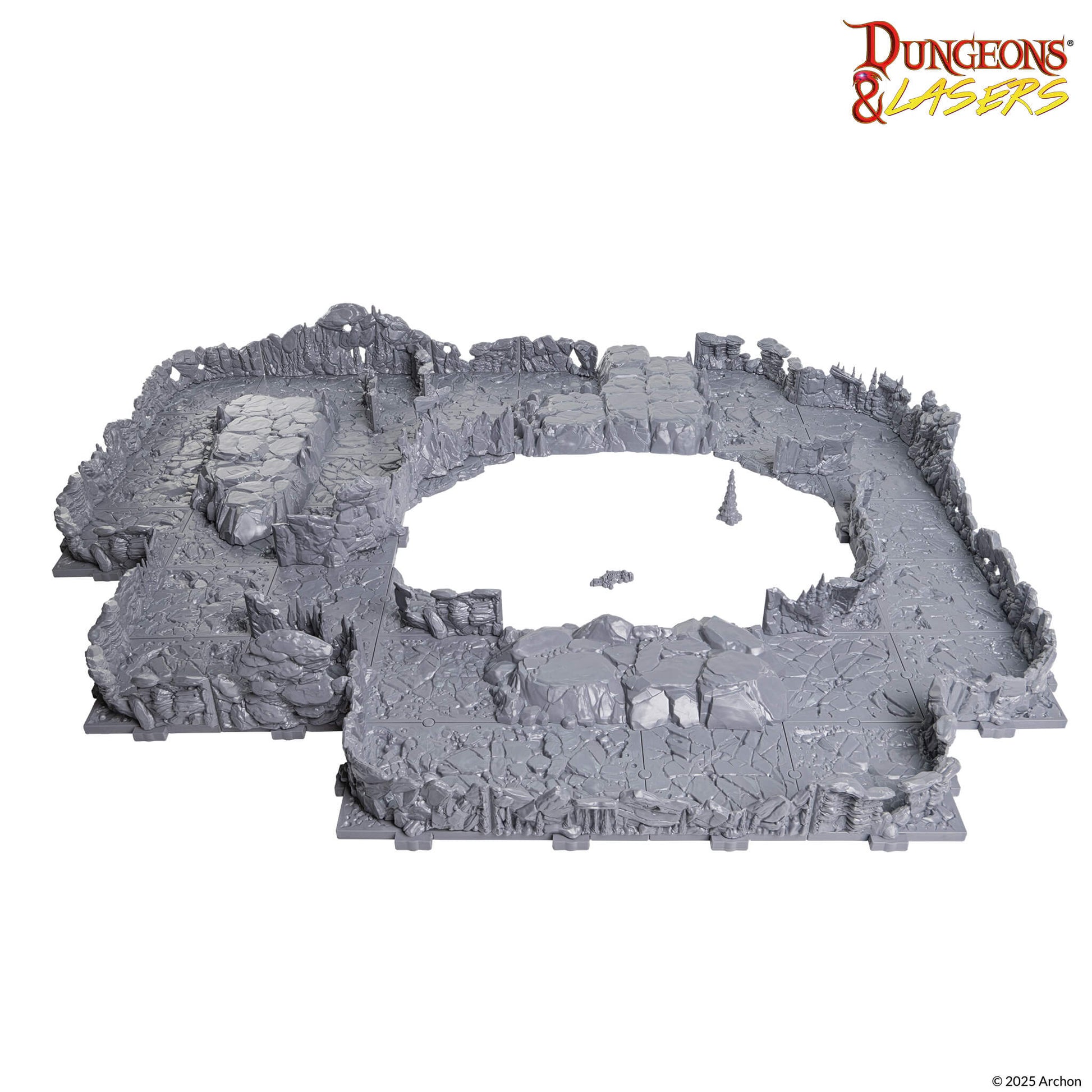 "Sombras, Piedra y Secretos. Aventúrate en el corazón de antiguas formaciones rocosas y forja tu camino a través de túneles sinuosos y cámaras ocultas." Un set modular de cuevas ideal para una construcción de mapas flexible y variada.