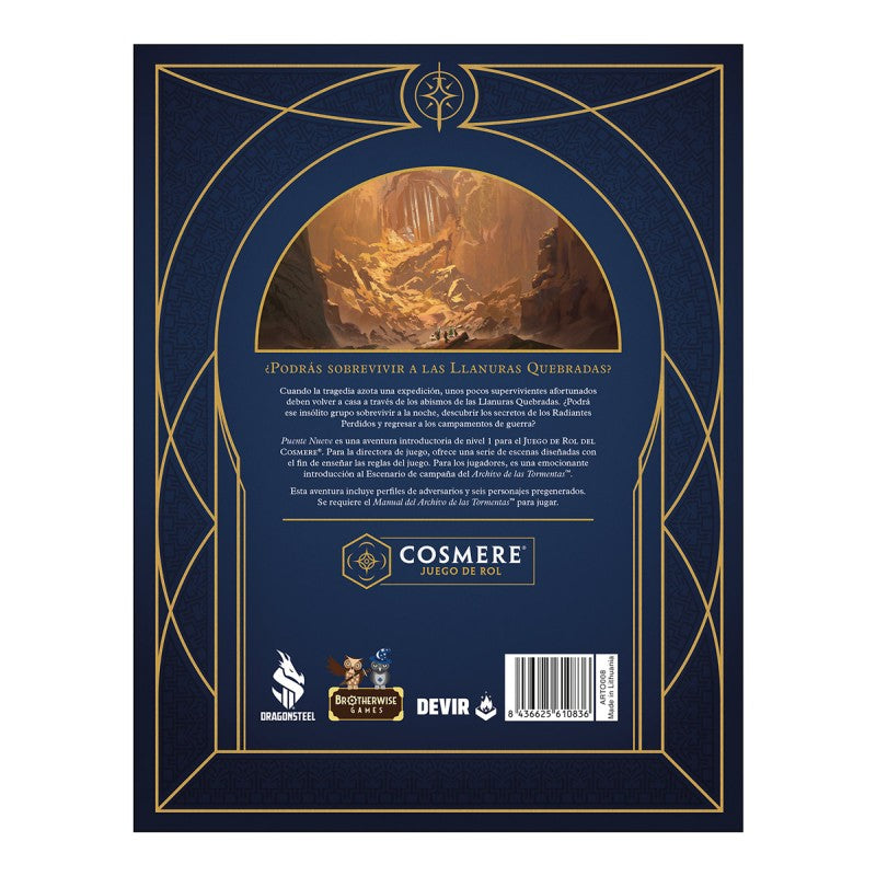 Puente Nueve es una aventura introductoria de nivel 1 para el Juego de Rol del Cosmere®. Para la directora de juego, ofrece una serie de escenas diseñadas con el fin de enseñar las reglas del juego. Para los jugadores, es una emocionante introducción al Escenario de campaña del Archivo de las Tormentas™.