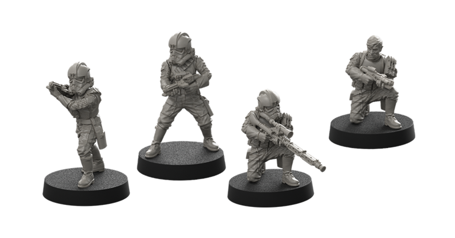 Al margen de a qué unidad las asignes, las siete miniaturas de plástico de las Fuerzas Especiales imperiales sin pintar que se incluyan en esta expansión, se pueden montar en toda una serie de configuraciones. Puedes equipar uno de estos soldados con un Fusil bláster T-21 o con un Fusil bláster E-11. Si estás montando el Escuadrón Infernal para desplegarlo junto a Iden Versio, las miniaturas de Gideon Hask y Del Meeko pueden montarse con o sin sus característicos cascos y Meeko va equipado con un Fusil de francotirador DLT-19x.
