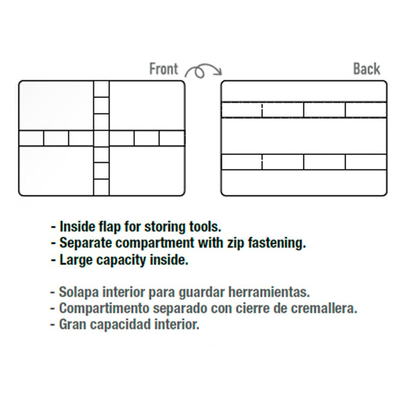 Su cremallera reforzada de alta calidad garantiza una apertura suave, permitiendo que el estuche se abra completamente. El tamaño es ideal para guardar herramientas entre sus bandas elásticas, gracias a una solapa con secciones en ambos lados, y permite almacenar otras herramientas y materiales en su compartimento principal.