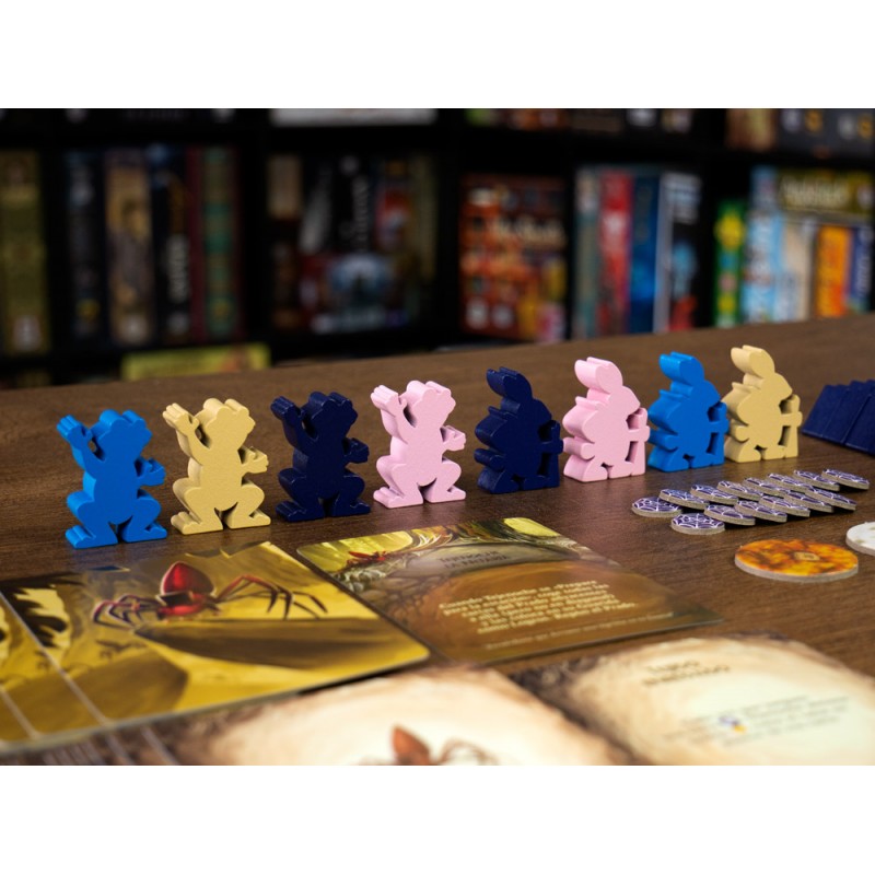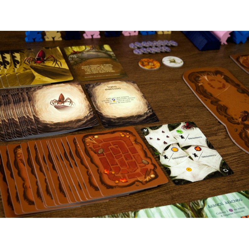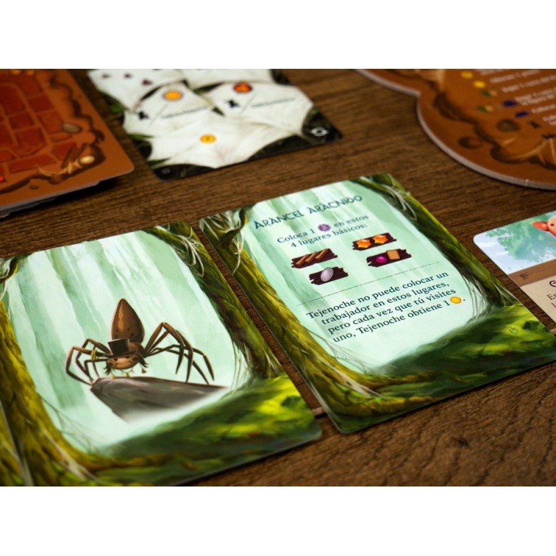 Entre las ramas más profundas y retorcidas de Bosquebrumas, yacen ocultos numerosos secretos. Los monjes de Bosquebrumas han registrado las leyendas de los héroes del pasado y del presente, incluidos los relatos del fundador de Everdell, Corrin Evertail, y otras figuras míticas de la historia del Valle Esmeralda. A lo largo de cada estación, los monjes ayudan a vigilar y guiar a los hermosos habitantes del valle.Pero en las entrañas del bosque, una misteriosa amenaza ha estado aguardando pacientemente, elaborando planes y siniestras conspiraciones… ¿Conseguirá sobrevivir el hermoso valle a la proliferación de telarañas de la astuta araña Tejenoche y su prole de arácnidos?
