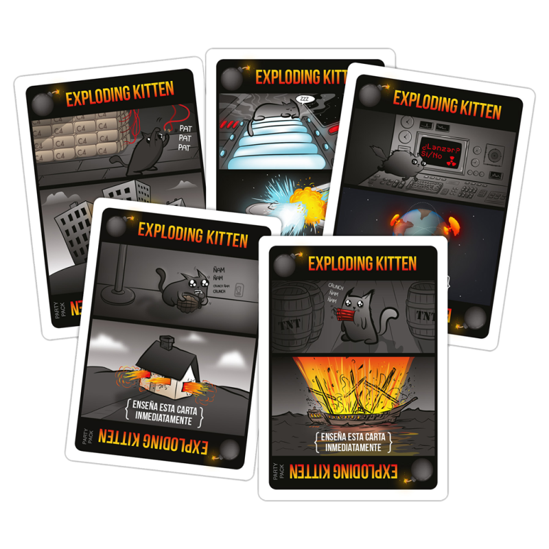 Se trata de una versión gatuna de la ruleta rusa con un gran componente estratégico. Los jugadores van robando cartas hasta que a alguien le sale un Exploding Kitten. Cuando esto sucede, esa persona muere y queda eliminada de la partida a no ser que tenga una carta de Desactivación, que anulará el efecto del Exploding Kitten con punteros láser, rascaditas de barriga y sándwiches de atún.