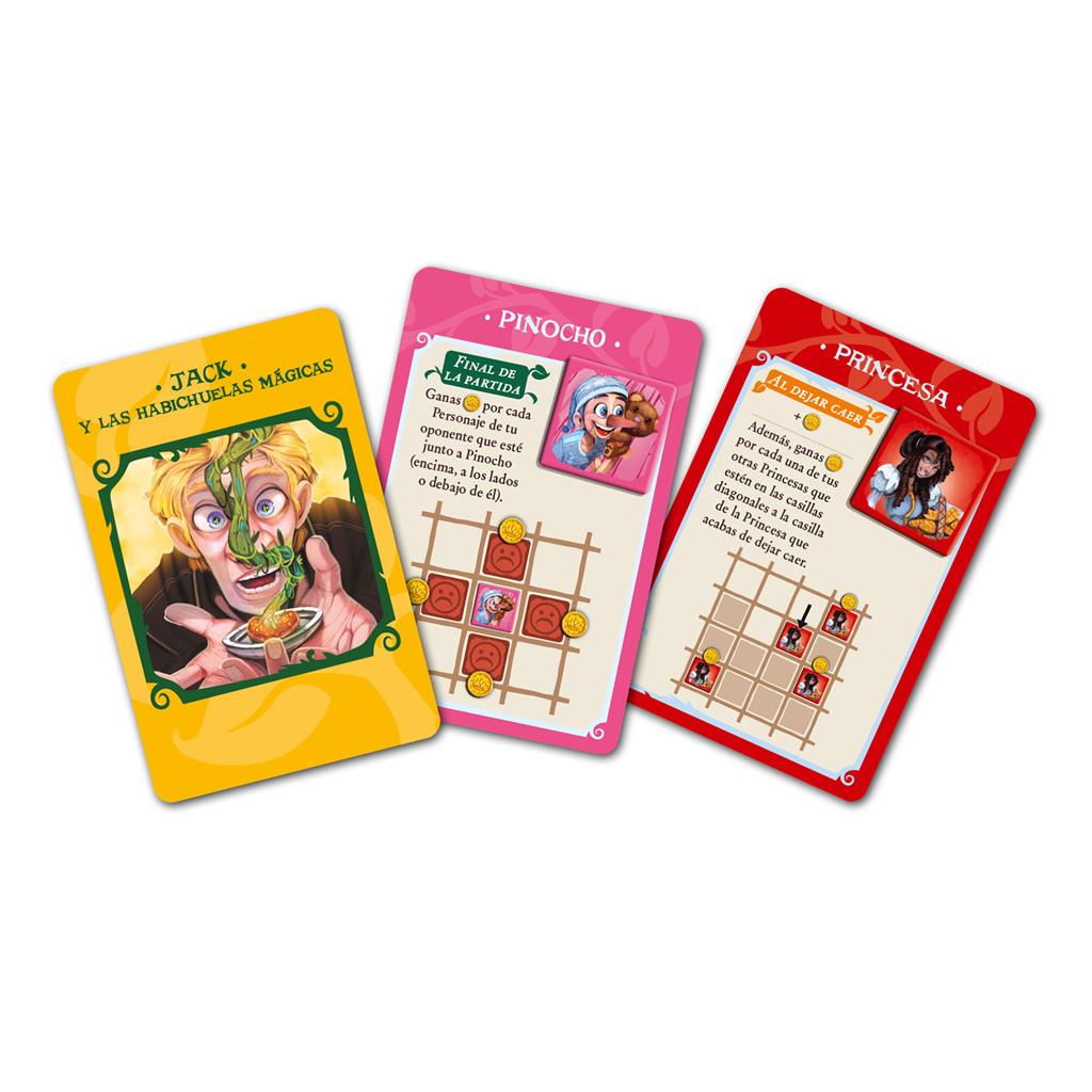 1 estructura de Posada de plástico, 8 cartas de Personaje, 1 tablero de Lista de huéspedes, 62 fichas de Oro, 1 bolsa de tela, 64 fichas de Personaje (Pinocho, Jack y las habichuelas mágicas, El flautista y las ratas, Caperucita roja, El lobo feroz, Los tres cerditos, La princesa, La reina malvada).