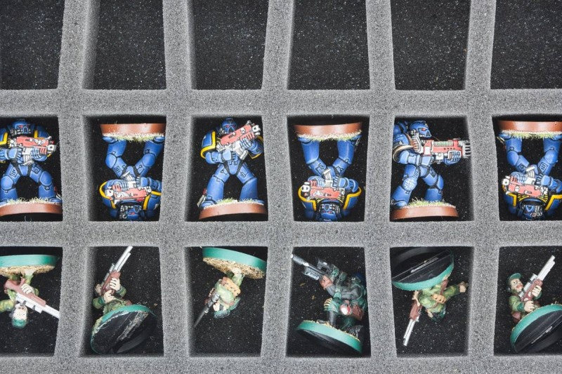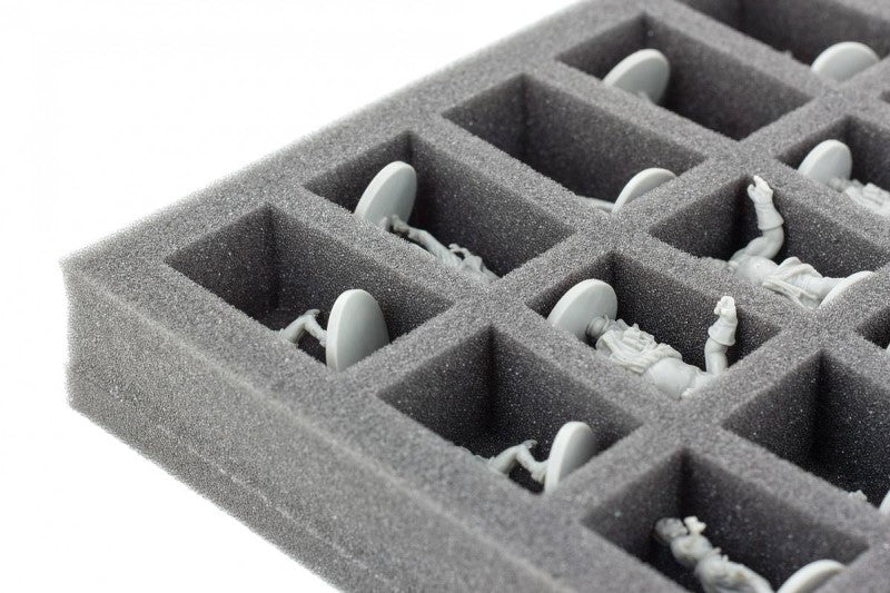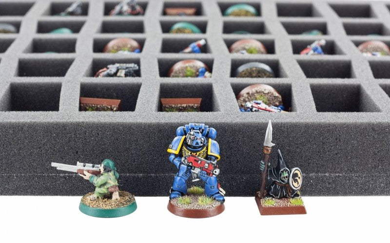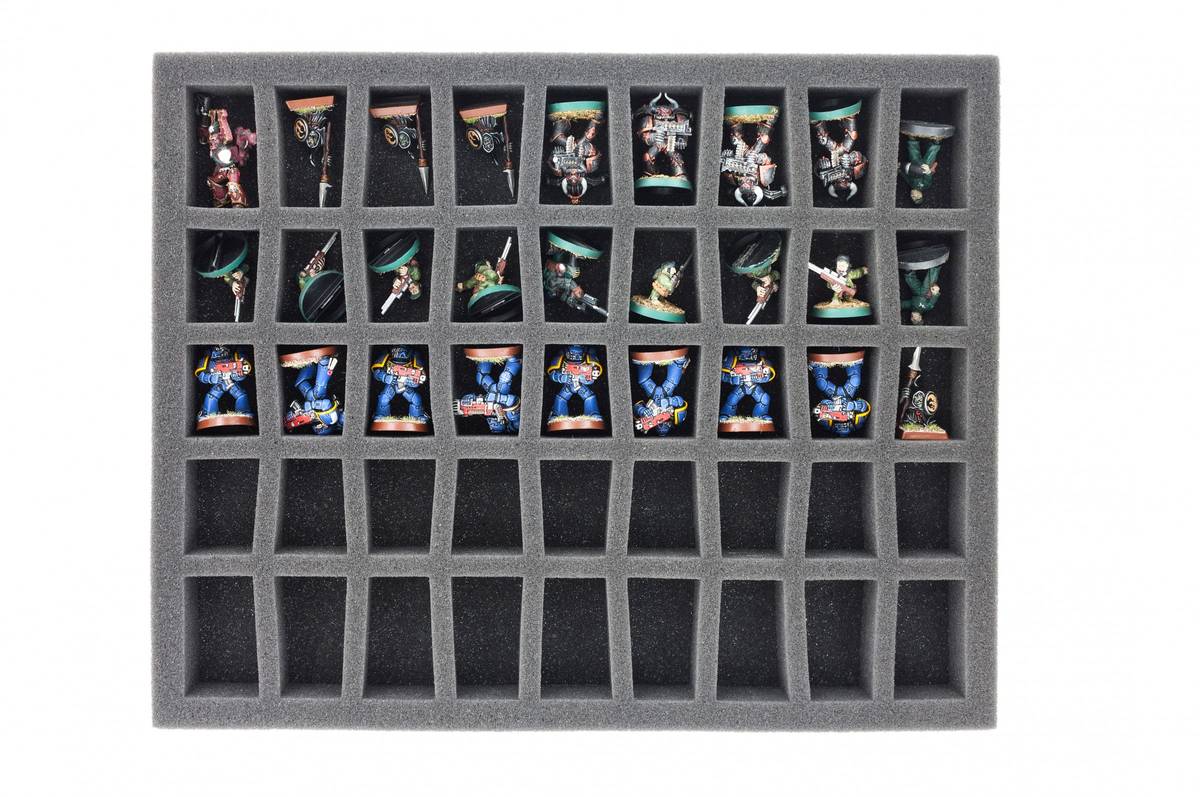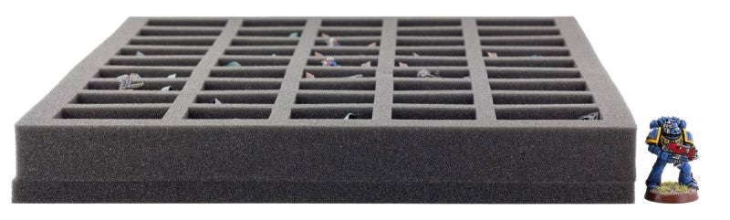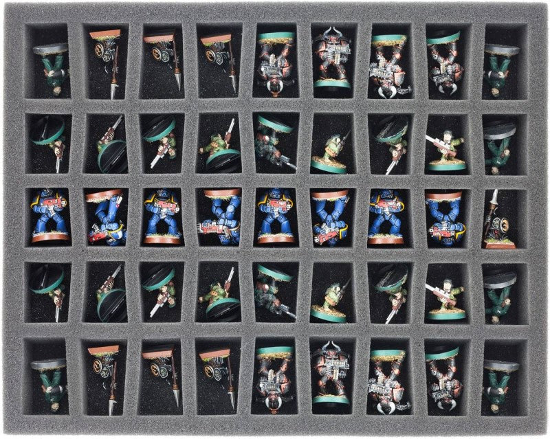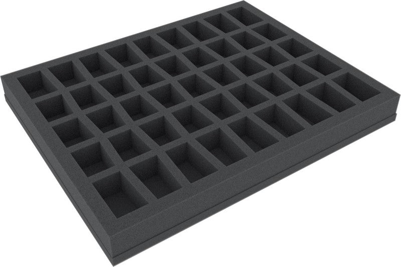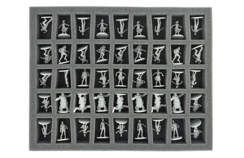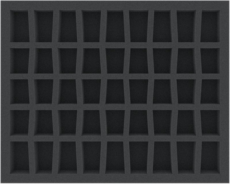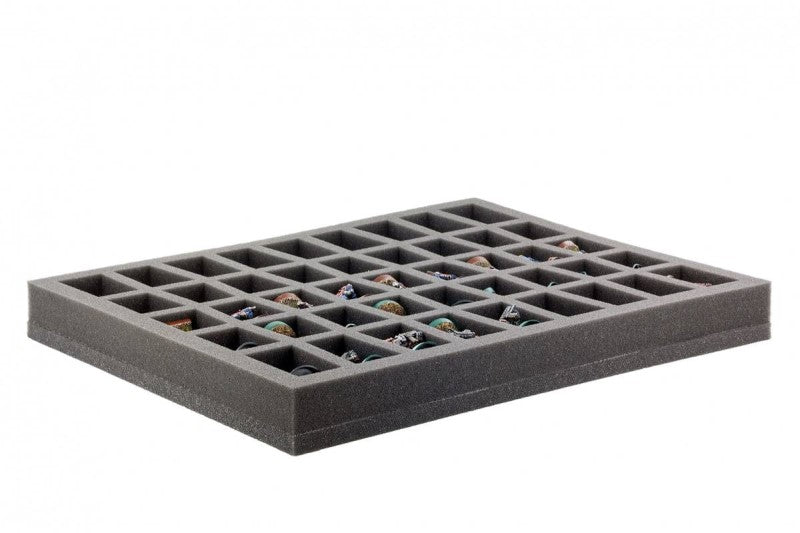 Bandeja de espuma con compartimentos en diseño de ranura en C. Los compartimentos tienen forma cónica. Las dimensiones de la bandeja de espuma con 45 compartimentos son las mismas que las de la bandeja de espuma con 36 compartimentos (345 mm x 275 mm). Los hemos dispuesto para ahorrar espacio y optimizamos las distancias entre los compartimentos. En la bandeja hay cinco filas preperforadas con nueve compartimentos. La forma cónica recortada proporciona espacio adicional para tus miniaturas.