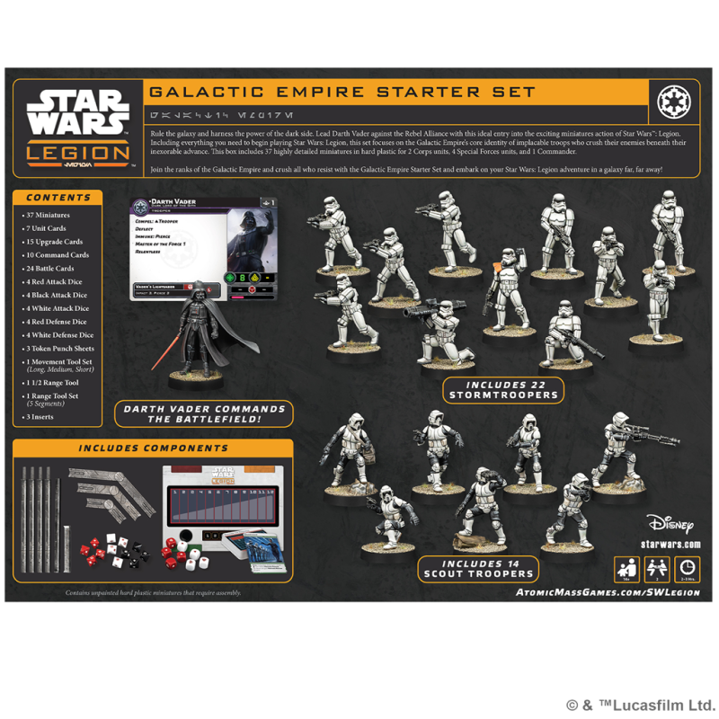 Gobierna la galaxia con puño de hierro y domina el poder del Lado Oscuro. Enfrenta a Darth Vader contra la Alianza Rebelde con esta introducción ideal al emocionante juego de miniaturas de Star Wars™: Legión. Esta caja contiene todo lo necesario para empezar a jugar a Star Wars™: Legión con la facción del Imperio Galáctico y sus mecánicas básicas, con tropas implacables que arrollan al enemigo bajo su inexorable avance. Se incluyen 37 miniaturas de plástico esculpidas con todo lujo de detalle para desplegar 2 unidades de Tropa, 4 unidades de Fuerzas especiales y 1 Comandante.