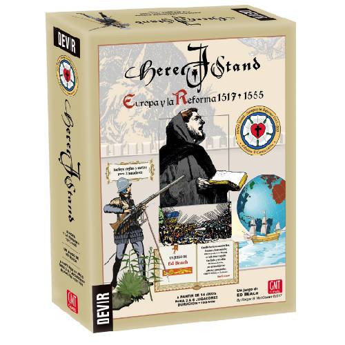 Here I Stand es un juego diplomático y estratégico para 2-6 jugadores en el que los jugadores adoptan el papel de líderes como Lutero, el Papa, Carlos V o Enrique VIII y tratan de obtener sus objetivos particulares a lo largo de casi cuarenta años (1517-1555)Here I Stand: Wars of the Reformation 1517-1555 es el primer juego en más de 25 años que cubre los conflictos políticos y religiosos de la Europa de principios del siglo XVI. Pocos se dan cuenta de que las mayores hazañas de Martín Lutero, Juan Calvino, Ignacio de Loyola, Enrique VIII, Carlos V, Francisco I, Solimán el Magnífico, Fernando de Magallanes, Hernán Cortés y Nicolás Copérnico caen en este estrecho período de 40 años de historia. . Este juego cubre toda la acción del período utilizando un sistema de juego único basado en cartas que modela los conflictos políticos y religiosos del período en un solo mapa punto a punto.