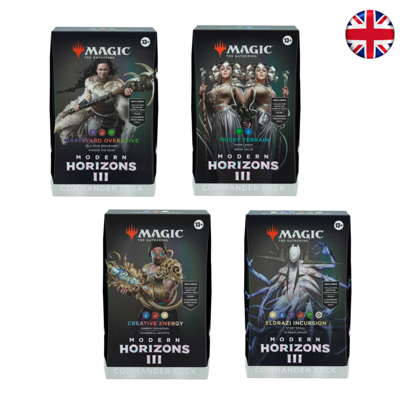 • CONSIGUE LOS 4 MAZOS DE HORIZONTES DE MODERN 3: llena tu cementerio y venga a los muertos con Graveyard Overdrive, acumula tierras y cosecha beneficios con Tricky Terrain, usa los contadores de energía para conseguir ventajas potentes con Creative Energy o desata a los eldrazi para devorarlo todo a tu paso con Eldrazi Incursion