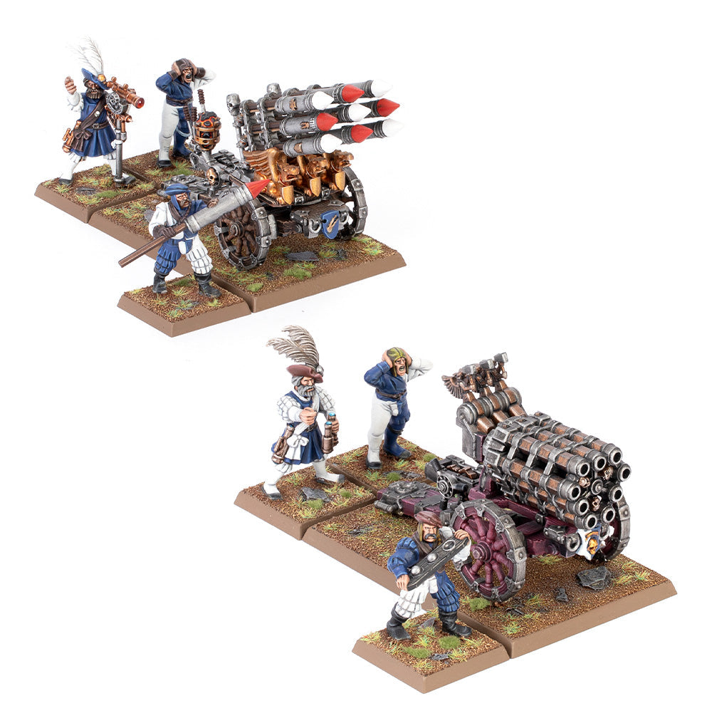 La Batería de Cohetes Helstorm también puede montarse como un Cañón de Descarga Helblaster, ambos potentes piezas de artillería pesada diseñadas para destrozar un ataque enemigo con su abrumador fuego. La primera puede bombardear el campo con marcadores de explosión, mientras que la segunda puede disparar hasta 30 proyectiles por descarga, aunque, todo hay que decirlo, con una alta probabilidad de que explote… ¿No sabes cuál elegir? Esta caja incluye las piezas necesarias para montar ambos, junto con seis tripulantes y algunos accesorios opcionales para el campo de batalla.