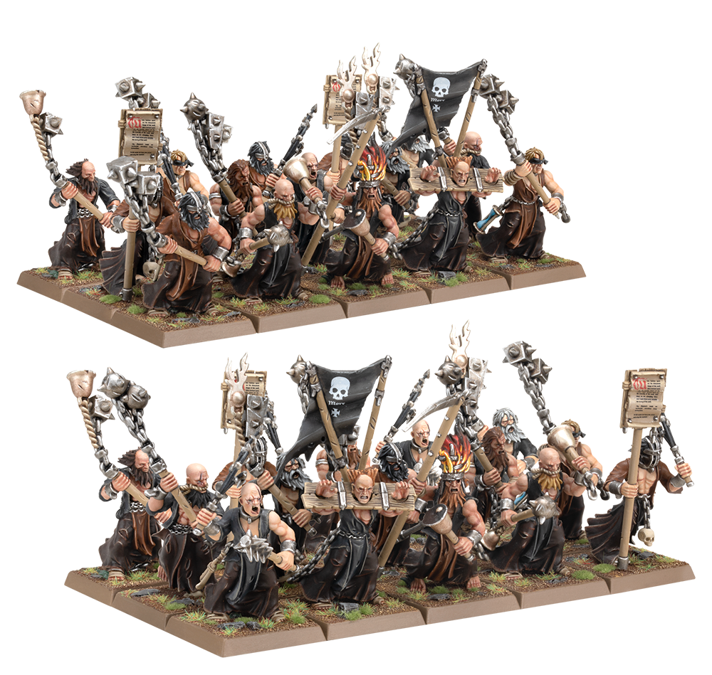 Tres tipos de infantería se encuentran en el Imperio del Hombre: regular, hábil y desquiciada. Los Flagelantes, aunque carecen de armadura y destreza en combate, compensan sobradamente con su regla especial Frenesí y sus brutales garfios a dos manos. Esta caja incluye 30 Flagelantes, con suficientes piezas para montar hasta tres Estandartes y tres Profetas de la Perdición, personajes con un carácter ardiente que lideran a sus compañeros en la batalla. Además, se incluye una hoja de transferencias de 290 piezas para personalizar tus miniaturas.