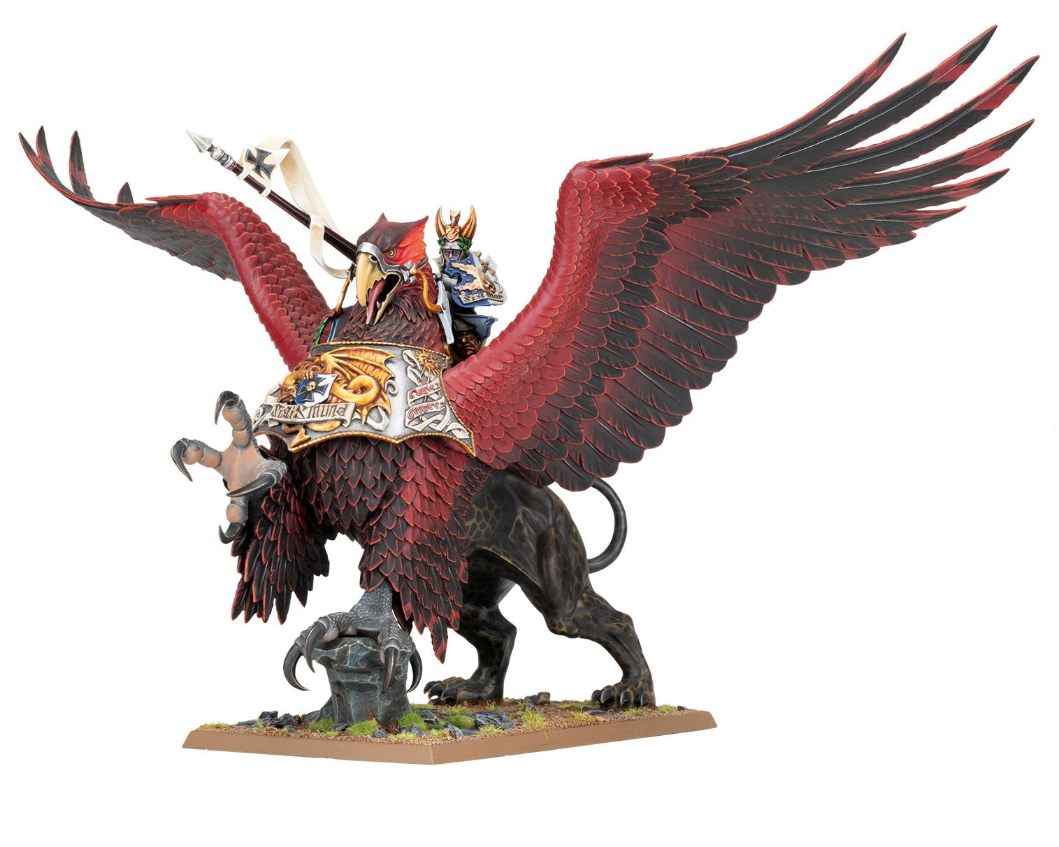 Los Grifos Imperiales son criaturas mortales que se encuentran en las Montañas del Borde del Mundo, sus polluelos son robados por valientes aventureros para criarlos como inteligentes y feroces monturas para sus señores. Pocas vistas son tan impresionantes como la de un General del Imperio a lomos de un Grifón Imperial sobrevolando el campo de batalla. Este kit de plástico también construye un Señor Mago en Grifón Imperial, solamente que este tiene dos cabezas.