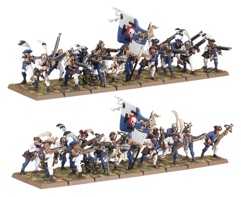 Las Tropas Estatales a Distancia son una unidad versátil que ofrece dos opciones de armamento: ballestas o pistolas, para un alcance mayor o penetración de armaduras, según lo que necesites en el campo de batalla. Esta caja incluye 30 soldados profesionales, con suficientes piezas para montar tres grupos completos de mando. Los Sargentos pueden equiparse con Rifles Largos Hochland y monos de pólvora. Además, se incluye una hoja de transferencias de 290 piezas para personalizar tus miniaturas.