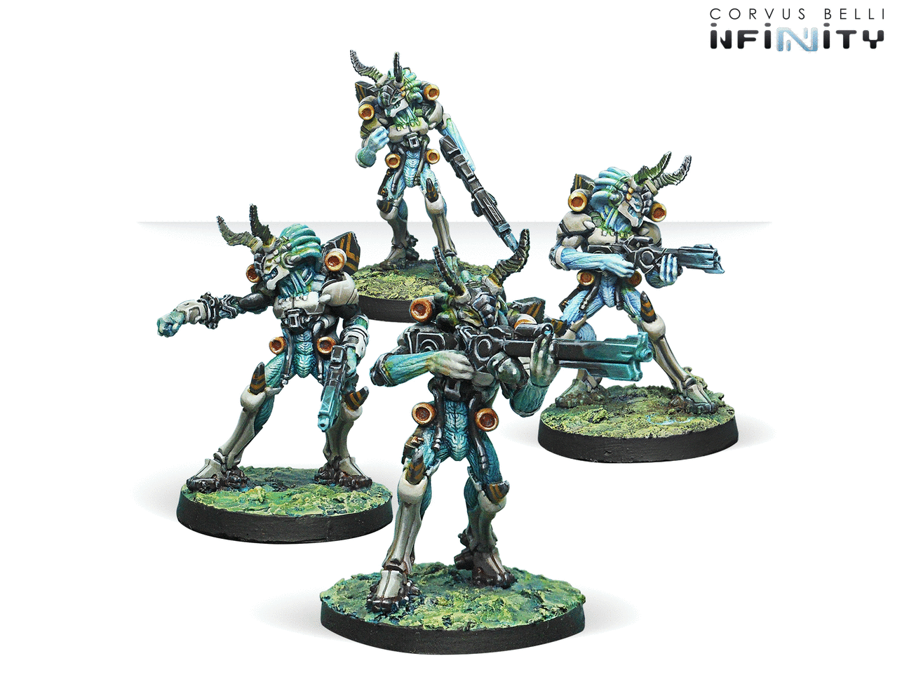 Reempaquetado de productos individuales formando un único producto. Caja con cuatro miniaturas que incluyen un Kaauri con Subfusil, un Kaauri con Rifle de Francotirador, un Kaauri con Fusil Combi y un Kaauri con Escopeta de Abordaje.