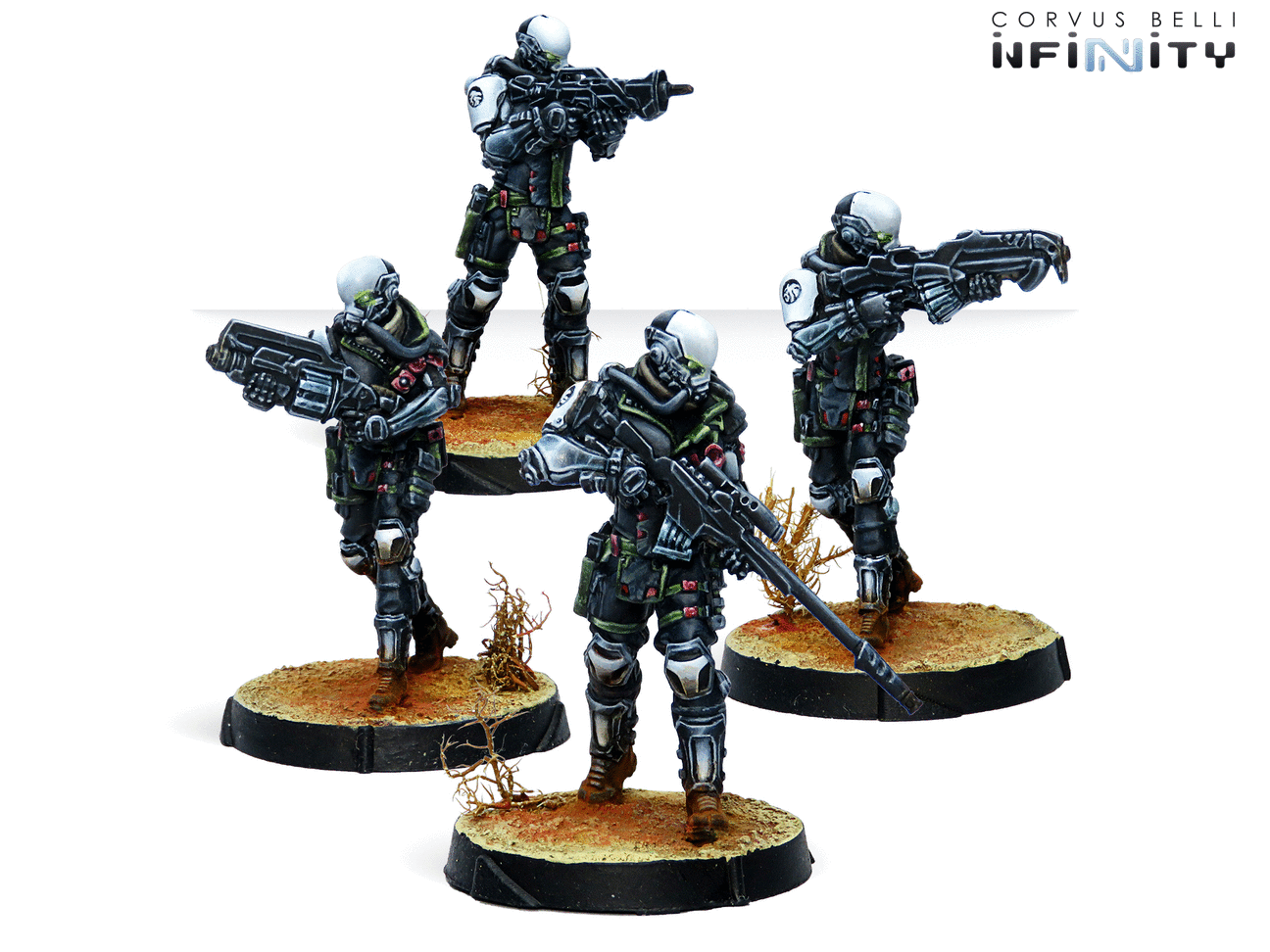 Esta caja incluye cuatro miniaturas: Un Kaplan con Fusil Combi, un Kaplan con Fusil de Francotirador MULTI, un Kaplan con Spitfire y un Kaplan con Lanzaadhesivo. Con esta caja podremos reforzar nuestro Ejército Sectorial de Qapu Khalqi de Haqqislam o para la Compañía Extranjera de NA2