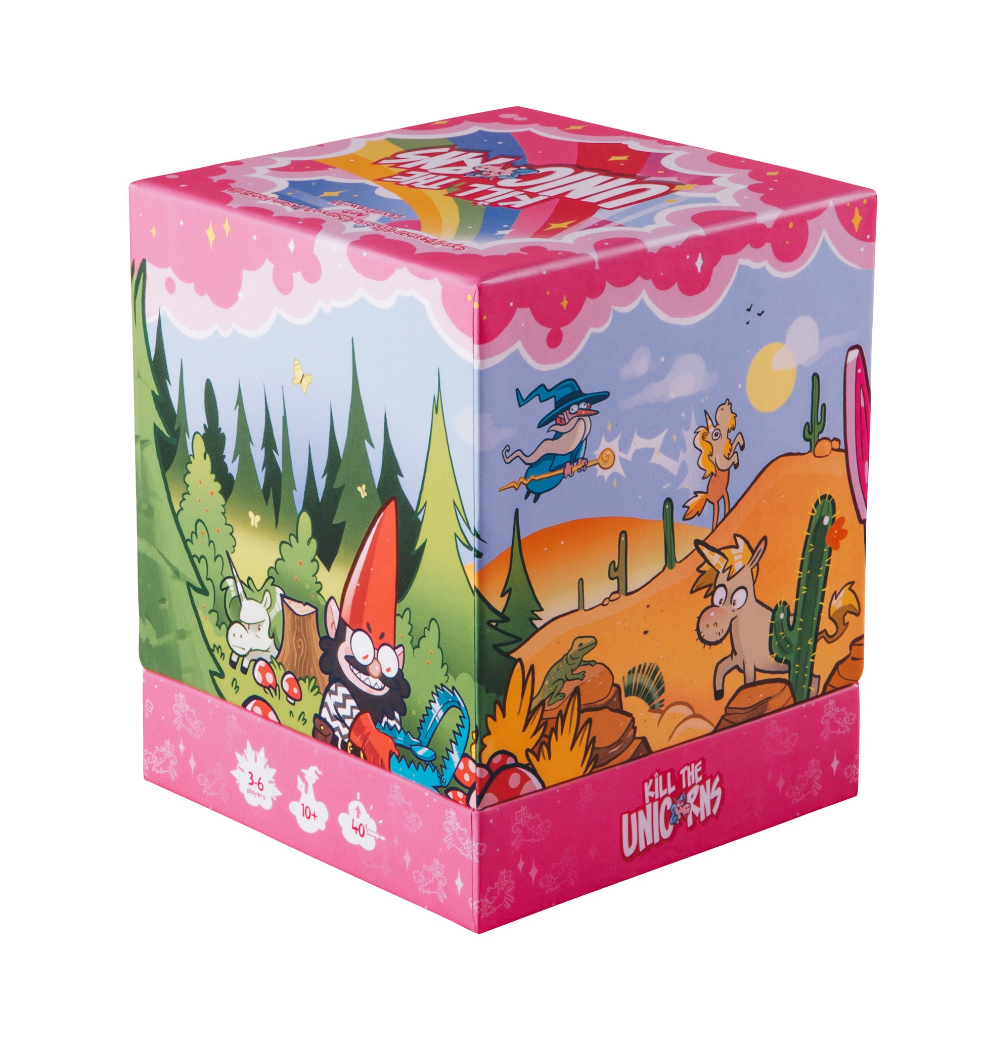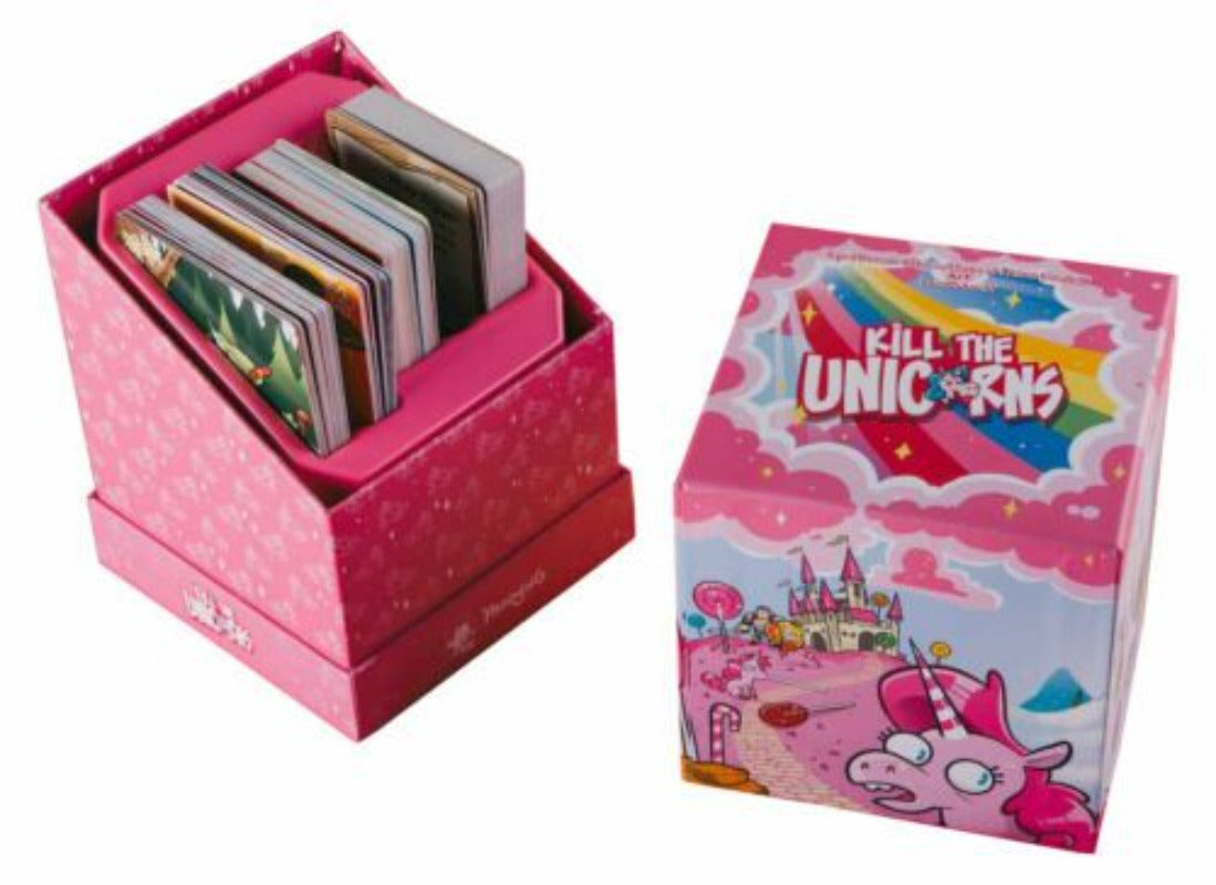 Kill the Unicorns es un juego de cartas con pujas a ciegas y colección de conjuntos. Cada persona toma el rol de uno de los pintorescos personajes del reino y tendrá como objetivo capturar tantos unicornios como le sea posible.