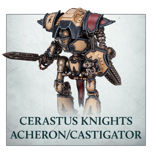 El Knight Castigator es la respuesta de una Casa a hordas de enemigos menores. Armados con el temible Castigator pattern bolt cannon, este Knight es capaz de borrar del mapa formaciones de infantería con una estruendosa lluvia de explosiones reactivas y un torbellino de filos de energía, y de destrozar con facilidad los vehículos ligeros enemigos. El Cerastus Knight Acheron es una visión temible en el campo de batalla, un segador de vidas cuidadosamente diseñado no solo para calcinar al enemigo, sino también para sembrar el terror por su apariencia y la forma en que realiza su letal tarea.