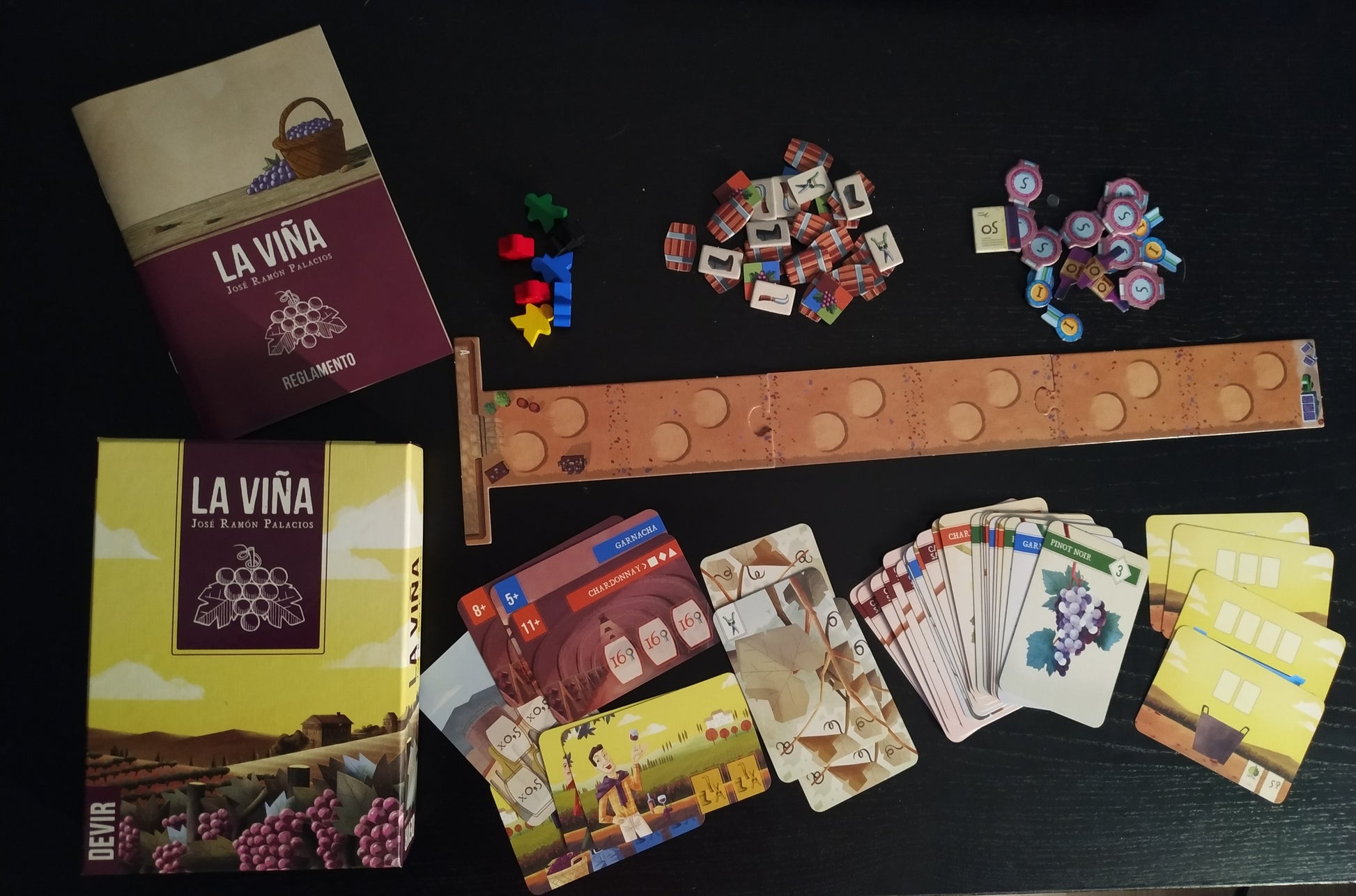 La viña es un juego de cartas en donde los jugadores avanzan por el tablero, recolectando cartas con las uvas más interesantes. Para recoger las cartas avanzas por una pista que representa las filas de un viñedo.