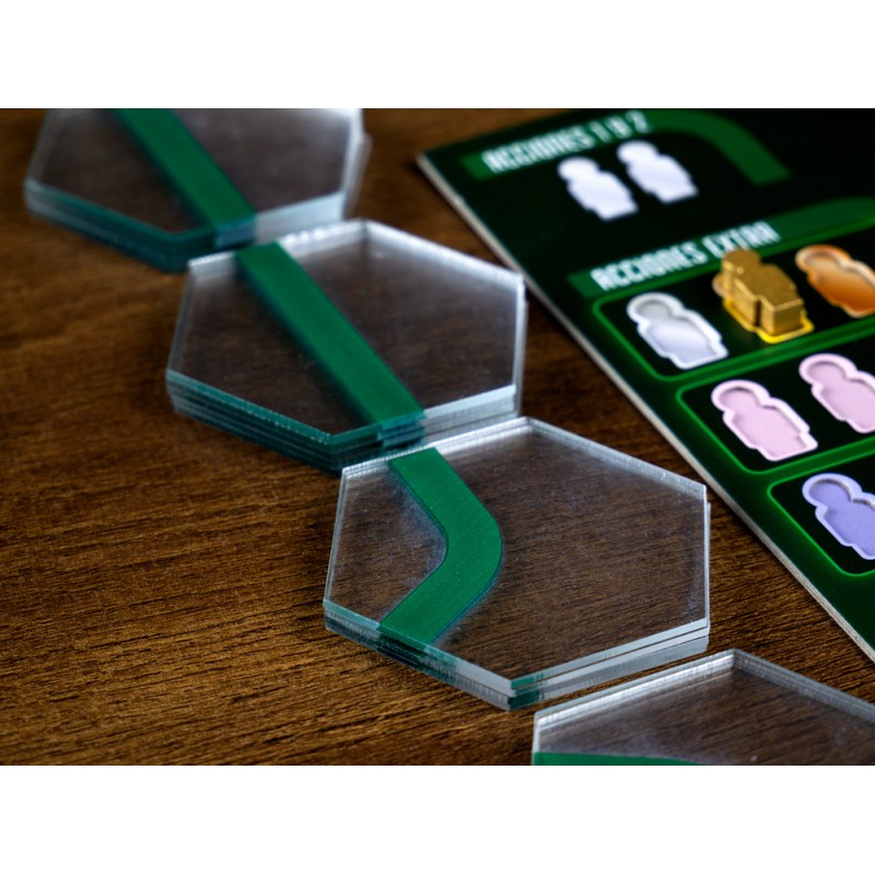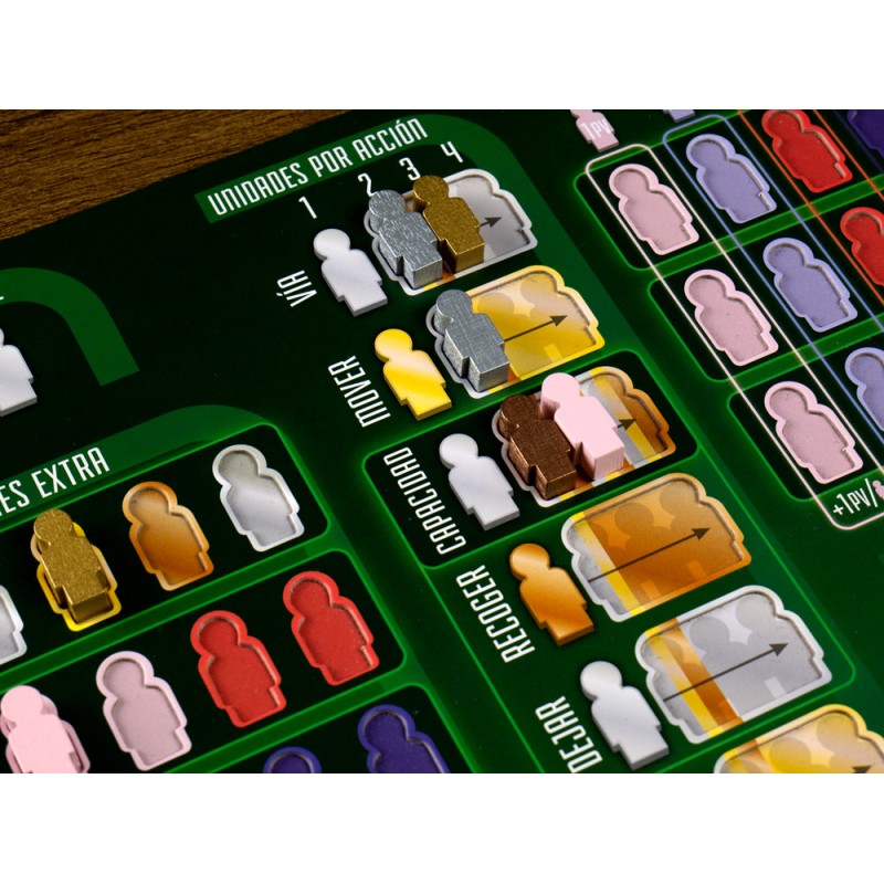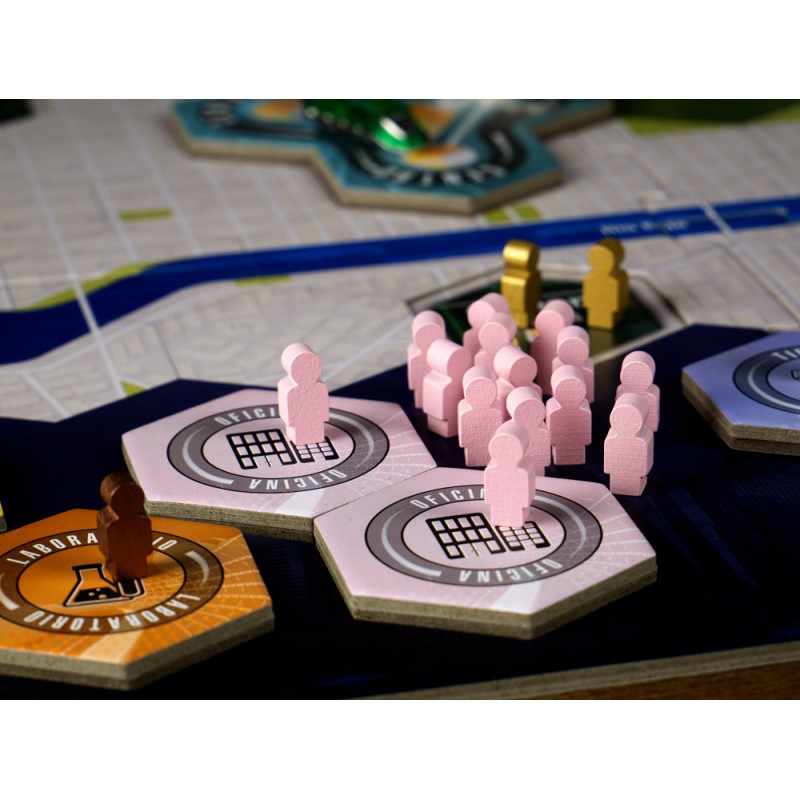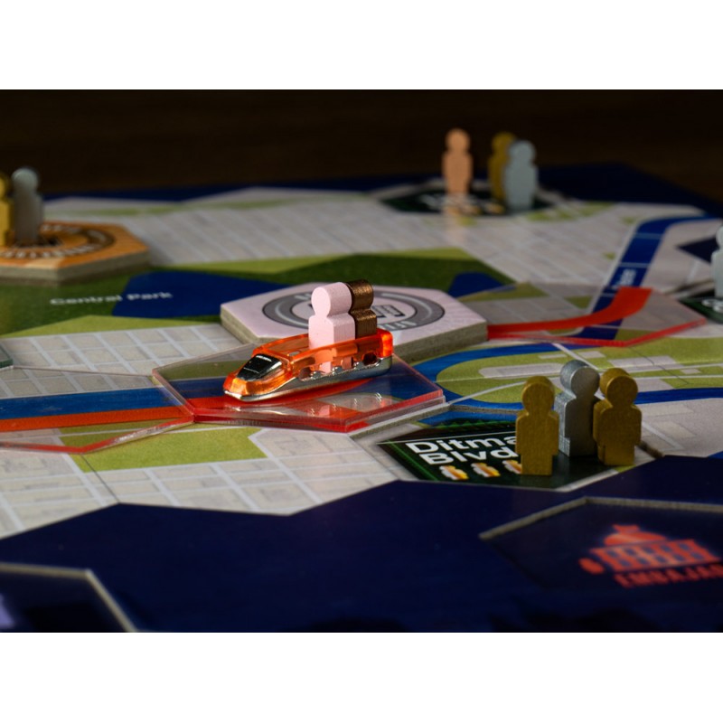 La eficiencia es la clave del éxito en este juego de construcción de motores, colocación de losetas, recogida y entrega. Las losetas transparentes permiten que tu ruta se superponga a las vías de tus oponentes, llevándote de una a otra estación. Los robots actualizarán y ajustarán tus habilidades de manera eficiente, aprovechando objetivos únicos para maximizar los puntos. Al final de la partida, el tablero de juego se habrá transformado en un moderno mapa del metro, con rutas de colores brillantes que conectan las estaciones de toda la ciudad.
