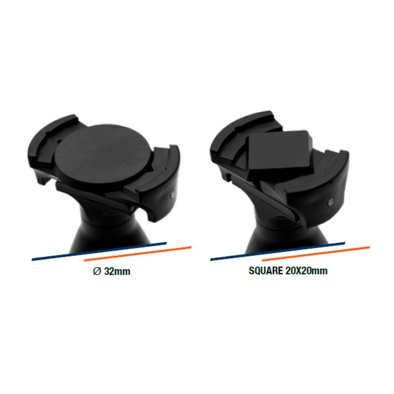 Permite sujetar de forma estable bases rectangulares, cuadradas, redondas u ovaladas.