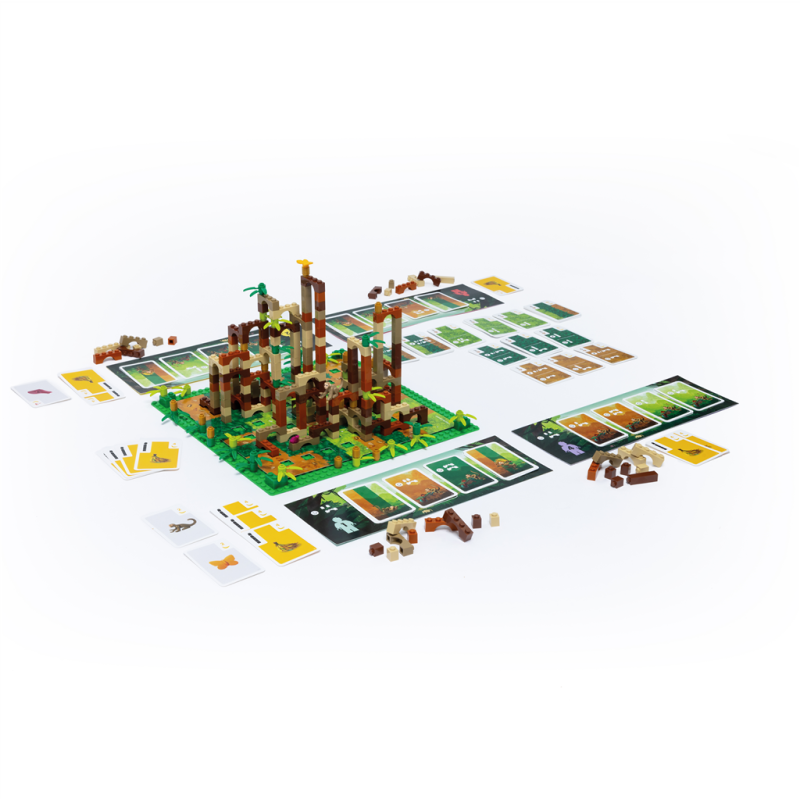 Piezas de construcción (80 Arcos, 80 Ladrillos, 16 Columnas), Piezas decorativas (32 Hojas de bambú y 16 Ladrillos decorados), Animales (1 Mono, 1 Mariposa, 1 Rana), Otros (4 Esquinas y 1 Base), Cartas (67 cartas de mono, 14 cartas de Bonificación, 3 cartas de Trofeo), Otros componentes (4 tableros personales, 1 bandeja de piezas y 2 Mapas de terreno de doble cara)