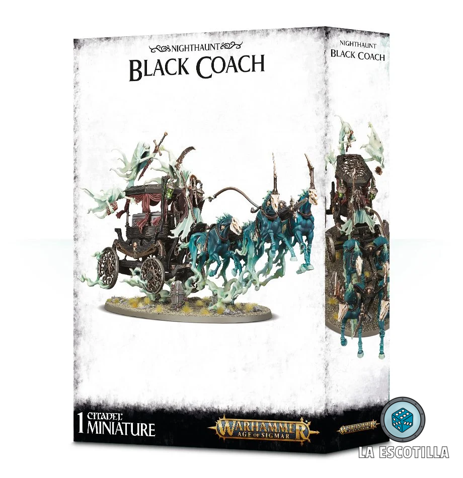 Este kit de plástico multicomponente contiene las piezas necesarias para montar un Black Coach. Construido a partir de pesados paneles de madera con remaches que sujetan los poderes etéreos de su interior, se trata de un carruaje funerario cuyas cortinas están atadas para dejar ver el macabro ataúd de su interior; este alberga un vampiro, que será visible si decides montar el ataúd sin su tapa. Las ruedas, dos pequeñas delante y dos más grandes detrás, están forjadas con hierro ornamentado, con motivos de cráneos y relojes de arena que simbolizan la muerte. Hay 3 Relic Bearers colgados del carruaje, llevando una espada, un libro y un cáliz, los efectos personales del vampiro transportado. Un Cairn Wraith conduce el vehículo, y puede montarse con una capucha o una corona, y llevar un rasgaalmas, una guadaña de la Parca o las manos vacías y gesticulando. 4 Nightmares tiran del Black Coach, flotando sobre hebras de energía etérea; las dos delanteras llevan enormes yelmos funerarios con pinchos.