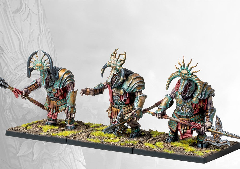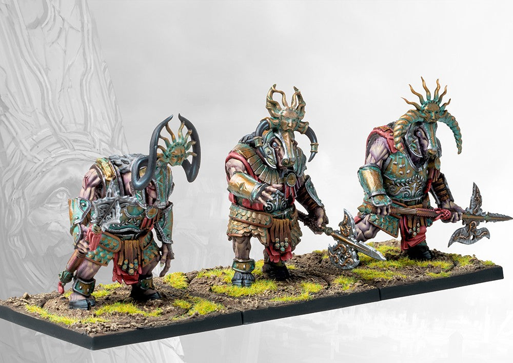 Guardianes de los templos de antaño, los Buccephaloi han regresado para ocupar el rol de apisonadora imparable, aportando un muy necesario poder ofensivo para las fuerzas del Viejo Dominio. Incluso desde las etapas tempranas del juego la combinación de Perforar (3) e Impactos Brutales (1), más según aumenta el Nivel de Poder Oscuro, proporciona una contraofensiva necesaria durante los momentos del juego donde los Regimientos Pesados enemigos meten presión.