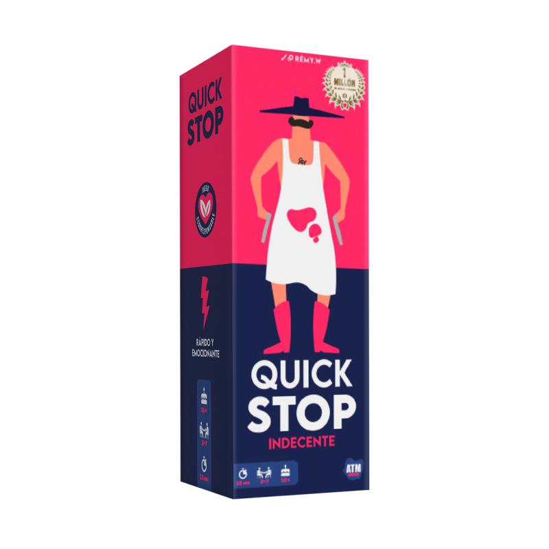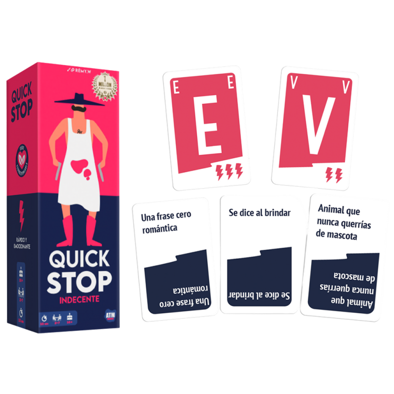 Quick Stop Indecente es un juego de cartas rápido, divertido e impredecible para mayores de 16 años. Los jugadores deben deshacerse de sus letras respondiendo palabras relacionadas con categorías más rebeldes que en el clásico Quick Stop.