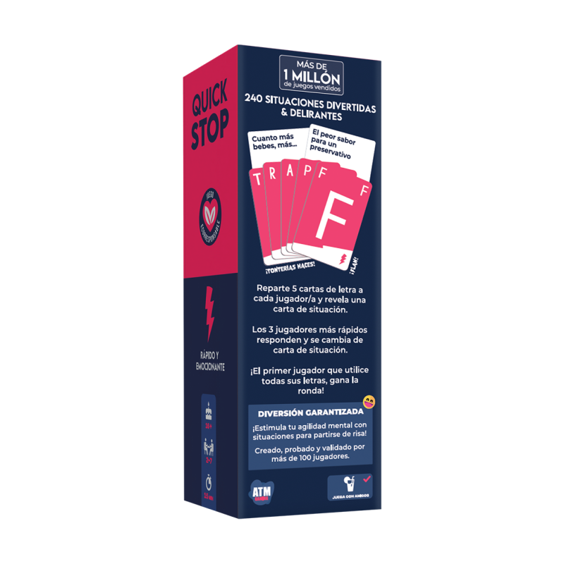 Quick Stop Indecente es la versión más rebelde del clásico juego: rápido, atrevido y perfecto para 2 a 7 jugadores. Deshazte de tus letras respondiendo categorías divertidas y descaradas.