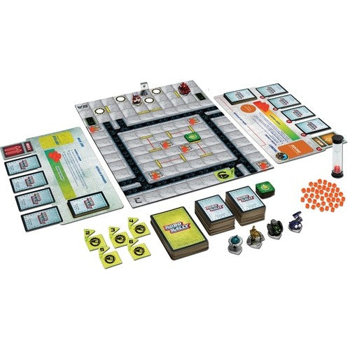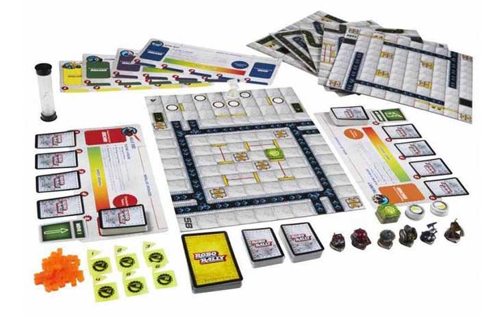 6 tableros de juego de doble cara, tablero de inicio de doble cara, 6 figuras de robot, 8 Peones de reinicio, 48 cubos de energía de plástico, reloj de arena de 30 segundos, 6 tableros personales de robot, 74 Cartas de Daños, bandeja, hoja de etiqueta, reglas del juego, 36 Peones de Puntos de Control, antena de prioridad de plástico, 6 Puntos de Control, 40 Cartas de Actualización, 6 mazos de 20 Cartas de Programación, 6 Cartas de Programación Especial
