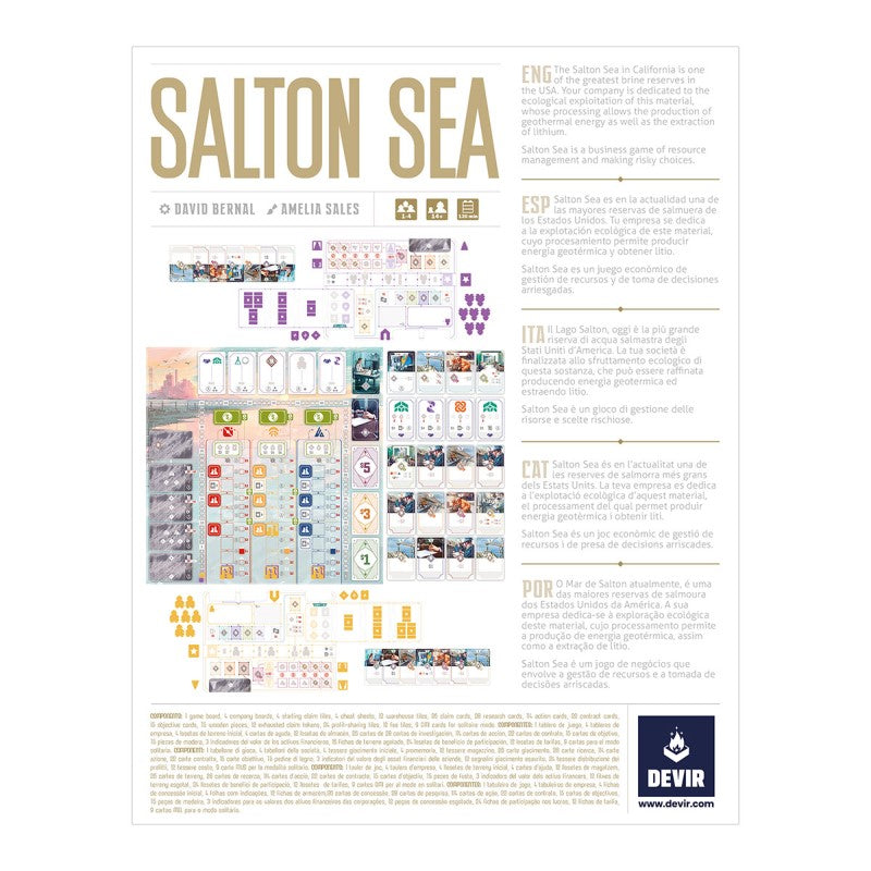 Diseñado por David Bernal e ilustrado por Amelia Sales, Salton Sea se puede disfrutar en solitario o en grupos de hasta 4 jugadores, a partir de 14 años, en sesiones de unos 120 minutos de duración. Durante la partida, los jugadores deberéis gestionar vuestras empresas geotérmicas de extracción de salmuera y generación de energía geotérmica y litio para obtener la mayor cantidad de puntos de victoria. La gestión eficiente de vuestra capacidad industrial y la toma de decisiones clave serán el motor de vuestra empresa.