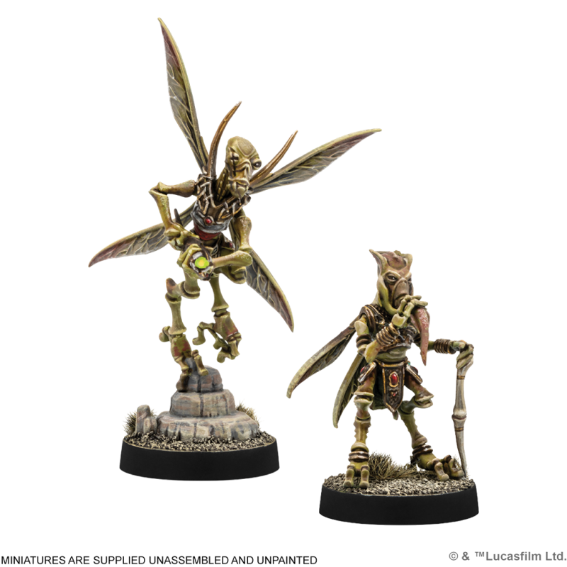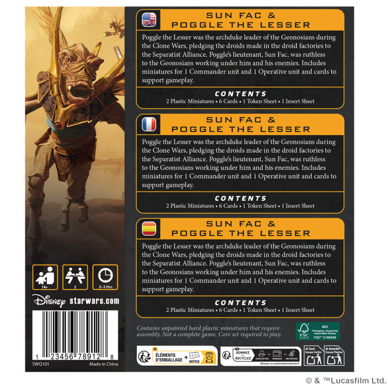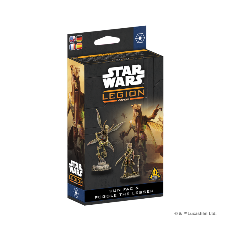 Poggle el Menor era el archiduque de los geonosianos durante las Guerras Clon, y puso los droides producidos en sus fábricas al servicio de la Alianza Separatista. Uno de los más fieles lacayos de Poggle, Sun Fac, actuaba como su lugarteniente y se mostraba tan implacable con sus lacayos geonosianos como con sus enemigos. Esta expansión para Star Wars™: Legión contiene 2 miniaturas con las que pueden formarse 1 unidad de Comandante y 1 unidad de Agente, así como las cartas necesarias para utilizarlas en tu ejército.