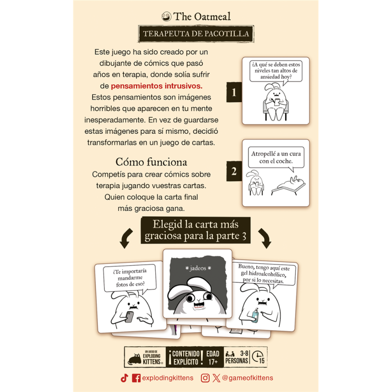 Es un juego que consiste en crear cómics de 3 escenas, empezando por una pregunta, seguida de una respuesta y, finalmente, un tratamiento psicológico. Ganáis 1 punto si vuestro tratamiento es el elegido como la mejor opción para terminar el cómic.