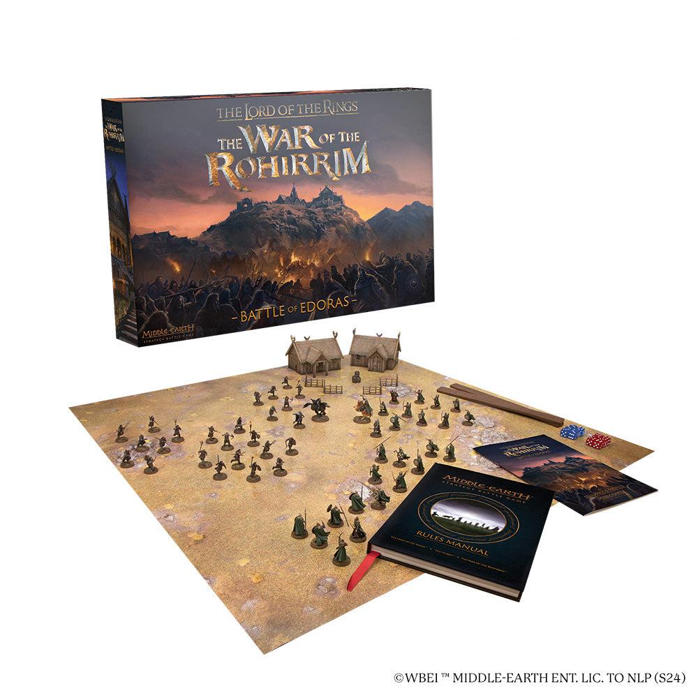 El Señor de los Anillos: La Guerra de los Rohirrim™ - La Batalla de Edoras contiene 56 miniaturas de plástico y dos Casas de Rohan, además de un manual de reglas completo de 176 páginas, un cuadernillo de escenarios y perfiles de 48 páginas, un tapete de juego de doble cara de 3'x3', dos guías de referencia, una regla de alcance y 12 dados.