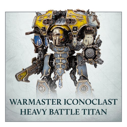 El Warmaster Iconoclast Titan es un ingenio divino diseñado con un único propósito: la destrucción. Incluso sus reactores han sido modificados para poder enfrentarse de cerca al enemigo. Los pocos que saben de la existencia del Iconoclast temen su llegada al campo de batalla, pues el avance de estás máquinas convierte el blindaje más formidable en poco más que una molestia. Allá donde pisa cae la civilización, quedando nada más que escombros que señalan su paso.